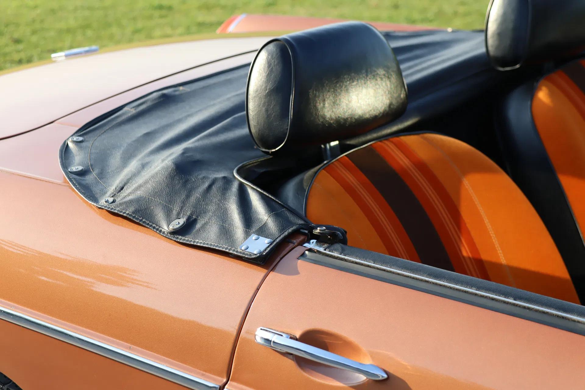 All 420 roadsters built were originally finished in bronze metallic paint with gold striping on the side and orange seat upholstery. A beautiful and retro colour combination. This example is free of damage and rust and is still in its original paint. The rubbers, lighting and chrome work are in good condition. The overall visual condition is good with only minimal signs of wear. Characteristic of the later B models are the front spoiler and the popular 4-spoke alloy wheels, which are also in good condition. The soft top is also in good condition with no tears or damage, and the fastenings work well.