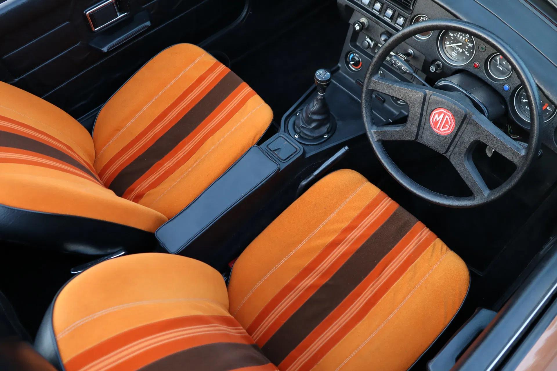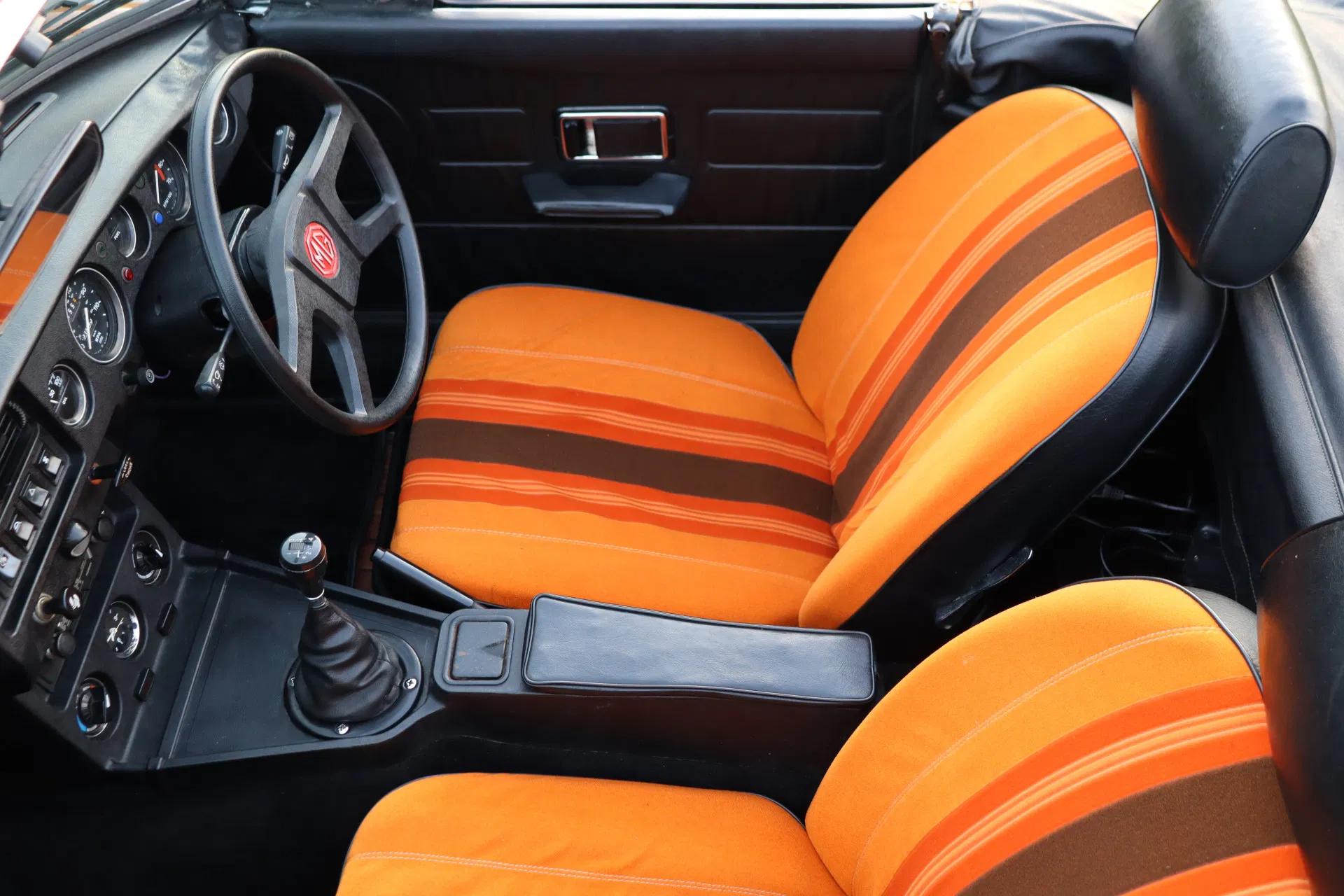 Een opvallend interieur door de oranje stoelbekleding met bruine strepen, zoals origineel geleverd. Ook het interieur bevindt zich in een originele en goede staat. Dankzij het bouwjaar is hij van comfortabele gemakken voorzien, zoals een middenarmsteun, een stuurwiel dat met leder bekleed is, verwarming en een Pioneer radio/cassettespeler. De vele tellers in het dashboard zijn onder meer een olietemperatuurmeter en een klokje. De gesynchroniseerde 4-versnellingsbak beschikt over een een overdrive, die zorgt voor een prettige ''5e versnelling''. De kofferruimte biedt plaats aan het reservewiel.