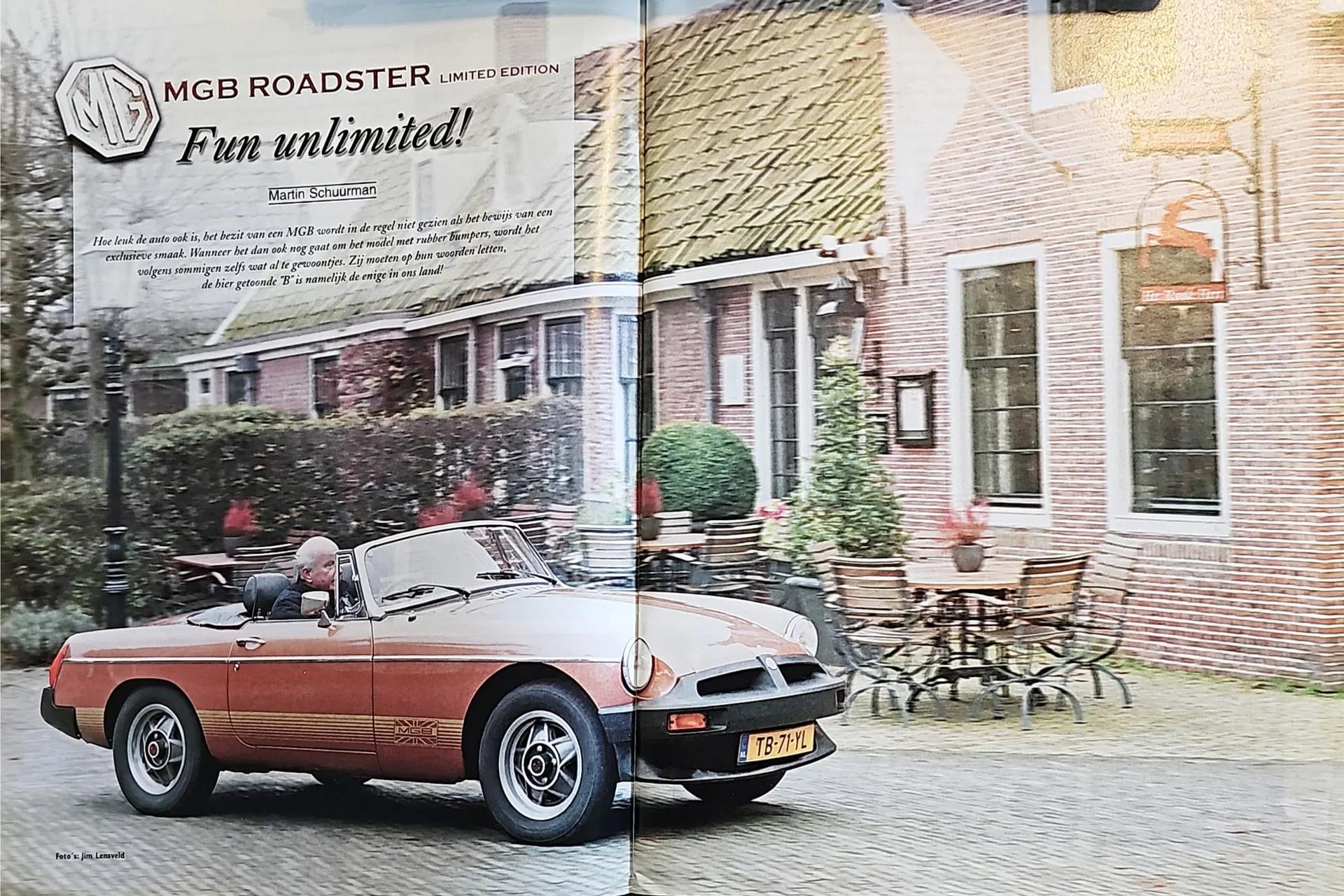 Uniek in Nederland: deze MG B Roadster Limited Edition, waarvan voor de Engelse markt slechts 420 exemplaren gebouwd zijn. Het betreft de laatste serie van de MG B die gebouwd is, toen de productie van de MG B eigenlijk al gestopt was. Destijds werd uit geïnteresseerden geloot om eigenaar van een Limited Edition te kunnen worden. De huidige eigenaar van deze auto had zich ingeschreven op een GT (coupé) waar 580 exemplaren van gebouwd werden, maar had geen geluk. Zijn in Engeland wonende broer had meer geluk bij de inschrijving op een roadster en werd eigenaar van dit exemplaar. Na 4 jaar van de auto te hebben genoten is de auto over gegaan naar de huidige eigenaar: een MG verzamelaar in Nederland met al decennia meerdere MG's in zijn bezit. De auto is in 1988 op Nederlands kenteken geregistreerd en is altijd gekoesterd en goed onderhouden. De auto is vooral gebruikt bij toerritten, waardoor de mijlenstand met 51.045 beperkt is gebleven (82.149 km). In tegenstelling tot veel andere exemplaren, is dit exemplaar in zeer originele conditie behouden. Doordat het een laat gebouwd exemplaar is, wordt het als velen beschouwd als de fijnst rijdende MG B.