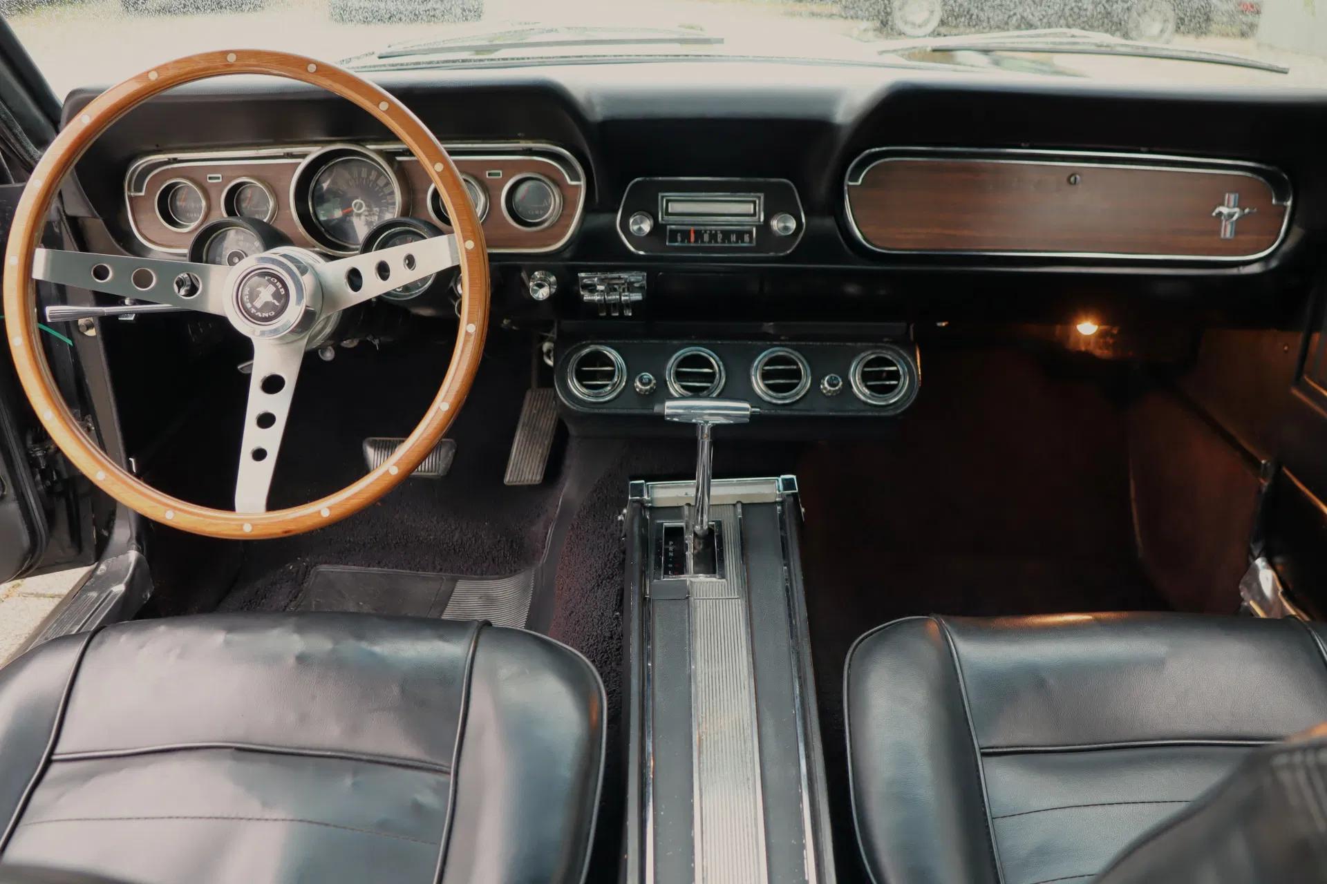 Het zwarte Pony-interieur verkeert nog in goede staat. De bekleding is uitgevoerd in zwart skai-leer. De bestuurders kijkt uit over het kenmerkende houten/aluminium stuurwiel en diepe wijzertellers. Ook is er een 'rally pack gauge cluster set' geplaatst met een tachometer en klokje. De originele Ford radio is nog aanwezig. Het dashboard en de instrumenten verkeren in goede staat. Ook de paneel- en hemelbekleding en vloerbekleding verkeren in goede staat. De airconditioning is bijgevuld. interieur vormt een ideale combinatie van comfort, originaliteit en klassieke looks. Bovendien is de Mustang een 2+2, waardoor 4 personen kunnen genieten van de rijervaring van de Mustang.