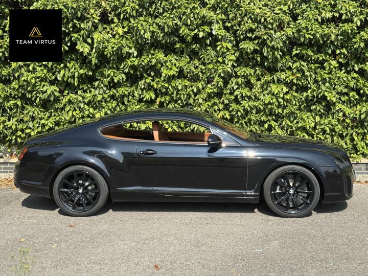 Unveiled in 2003 at the Geneva Motor Show, the Continental GT was a different animal. The Crewe-built cars numbers were impressive with the twin-turbo, VAG 6.0 litre W12 engines, developed in the VW Phaeton and stillborn W12 sports car, producing 552bhp and 479lb ft torque. This prodigious output was fed through a six-speed automatic box from the new A8 and distributed by the Quattro four-wheel drive system. 0-60 in 4.7 seconds and a top speed of 196mph were significant for a car of this stature. Some six years later, also in Geneva, Bentley unveiled their new 621bhp Continental Supersports which was indecently quick with 0-60mph in 3.7 seconds and a top speed of 204 mph, making it the fastest and the most powerful production Bentley ever. With a revised 'Tiptronic' automatic gearbox employing a 'quick-shift' system, gear change times were reduced by 50%. In order to cope with the increased power, it was necessary to have carbon fibre reinforced silicon carbide ceramic disc brakes - the largest and most powerful brakes ever fitted to a production car. As the Supersports evolved Bentley managed to accidentally create a very limited-edition car, the two seat examples were not selling as hoped because at the time most of the Bentley ownership comprised a demographic of drivers who wanted four seats and a softer ride. Enter the SuperSport ‘comfort seat’ option, a four-seat option that still gave performance, clearly not that of the two-seater but it gave a very clean way for Bentley to exit what appeared to be a fabulous car but not for their then customer demographic, thus leaving those with the full two-seat example with a low production car and now highly desirable. This stunning low mileage Bentley Continental Supersports is a 2010, UK supplied, right hand drive example finished in metallic Onyx Black with Beluga and Newmarket tan leather trim. Presented with a pair of heated, two-piece, carbon fibre sports seats and Breitling analogue clock sitting above the £5,000 uprated NAIM premium satellite navigation by Bentley Bristol. Upgrades by Bentley have not stopped there, originally a Bentley Pangbourne demonstrator car, as many options as possible were specified including a Bentley warrantied and fitted Acropovic exhaust system which was circa £7,000 alone and added between 7-12bhp along with an uprated leather steering wheel. Where rear passengers would normally reside, a carbon fibre cross-brace spans the cabin, generating torsional rigidity, showing the real intent of the 'Supersports', this is a rarity now as many cars were converted by Bentley to four seat cars to help sales. Sitting on 20" alloy wheels, the car is fitted with carbon-ceramic brakes, adjustable suspension and a host of other options making it, effectively, a very luxurious 'Group A Touring Car' for the road with incredible power. Serviced at 98, 344, 2550, 3559, 4592, 5079, 5992, 7402, 11745, 13567, 16702, 18473, 20713 and 21399 – boasting an all-Bentley main dealer history, the latest the larger of the scheduled carried out in February 2024. Supplied with its driver's manuals, spare keys, service book and a UK V5C registration document,this fantastically quick car would put a smile on any driver's face. We welcome any inspection of this amazing, showroom condition, Bentley with the W12 cherished plate included in the sale.