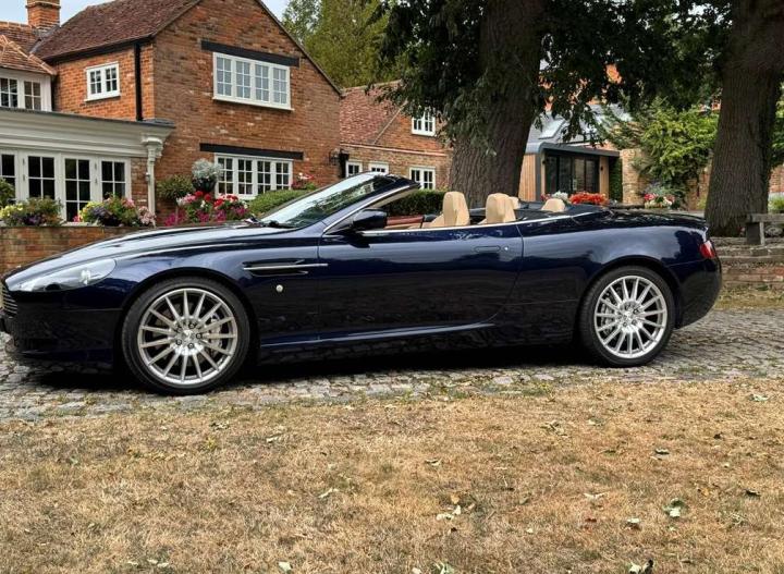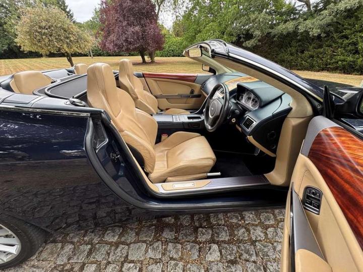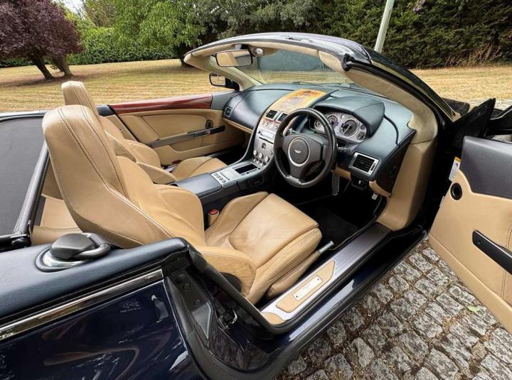 2006 Aston Marin DB9 Volante, finished in Midnight blue with contrasting Sandstorm hide interior with best quality dark blue Wilton carpet throughout. In addition, it has Walnut veneers to the centre console and door cappings, all of which are in lovely condition.. This is a beautiful, well-kept and well serviced example that has had only 3 previous keepers in 19 years. The mileage covered is just over 36,000, which is “Just Run-in” for the V12 5.9 litre Aston Engine and therefore still performing perfectly. The mileage is backed up by the DVLA MOT records, together with a stamped-up service book containing 15 service stamps and a number of corresponding service invoices. Fitted with the more desirable, paddle-shift automatic transmission making this car extremely easy to drive. It has the benefit of 19” multi spoke, sports alloy wheels shod with the correct Bridgestone Potenza speed rated tyres, all of which are in excellent condition. In addition, it has heated electric seats with lumbar support, Powerfold mirrors, fitted wind deflector, an indoor car cover, a battery charger, and an electric tyre inflator. This superb DB9, now represents exceptional value for money for one in this condition at only £31,950. It comes with a 6 month warranty for added peace of mind.