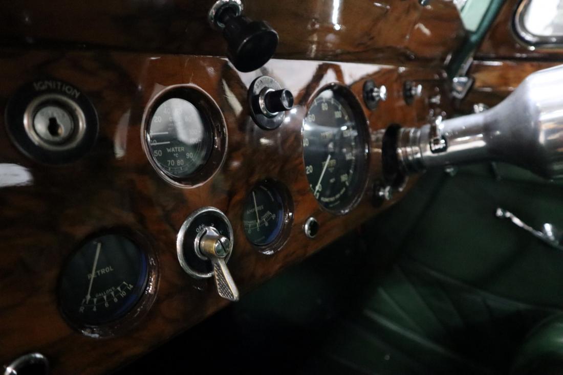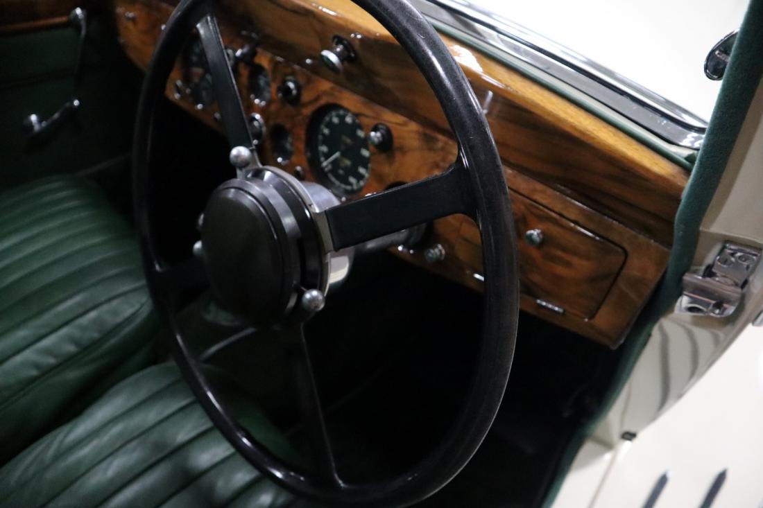 On December 21, 1937, this stately Jaguar SS 2.5 Liter Saloon left the factory to be shipped to Belgium. Here the car was registered on July 14, 1938. Many documents and the Heritage Centificate indicate that the original color was Suede Green. A somewhat dull color that fortunately was changed during the restoration to the also original Ivory. In combination with the beautiful green leather and tasteful wood finished interior, this is a real stunning combination.